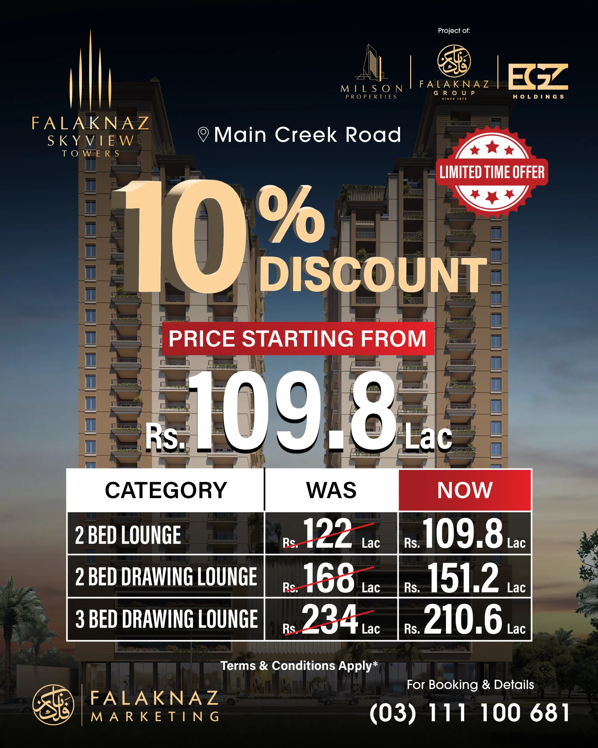 Falaknaz Skyview Towers is a premium residential and commercial development designed to combine convenience, lifestyle & modern living under one roof. The project offering 1, 2 & 3-bedroom luxury apartments, along with shops and showrooms. The project features 4 floors of car parking with 25+ modern amenities designed for a comfortable, lifestyle-driven living experience.